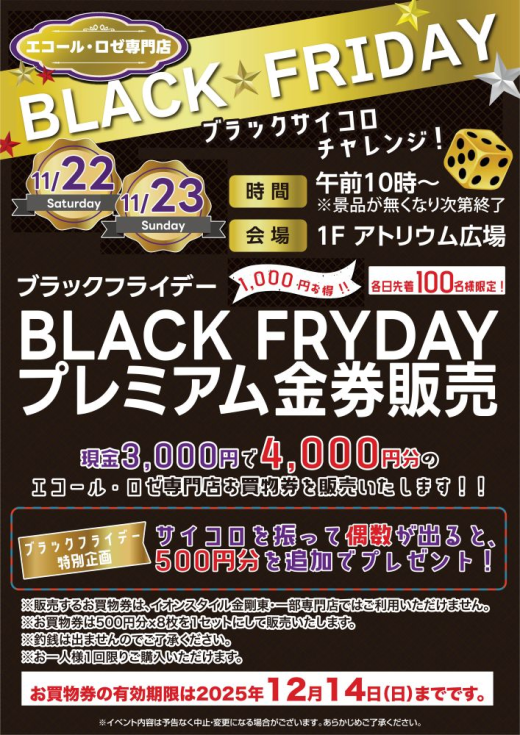 各日先着100名様限定で現金3,000円で4,000円分のエコール・ロゼ専門店お買物券を販売いたします!