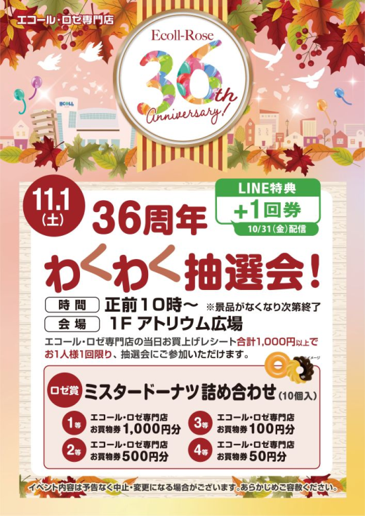 エコール・ロゼ専門店の当日お買い上げレシート合計1,000円以上をご持参のお客様に、エコール・ロゼ専門店でご利用いただける★5%★分のお買物券をプレゼント!!