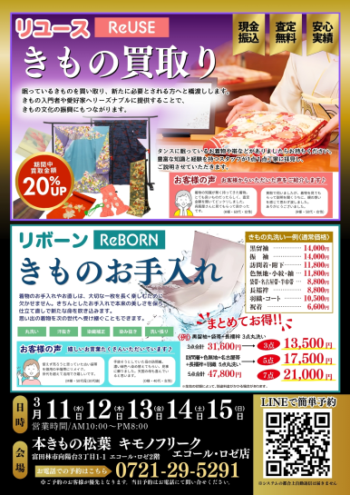 3/11よりお着物のお手入れが通常よりもお得に、お着物の買取が20%アップとなります。