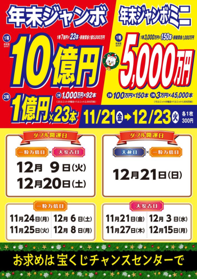 宝くじチャンスセンターでは11月21日から12月23日まで、2種類の『年末ジャンボ宝くじ』を同時発売。